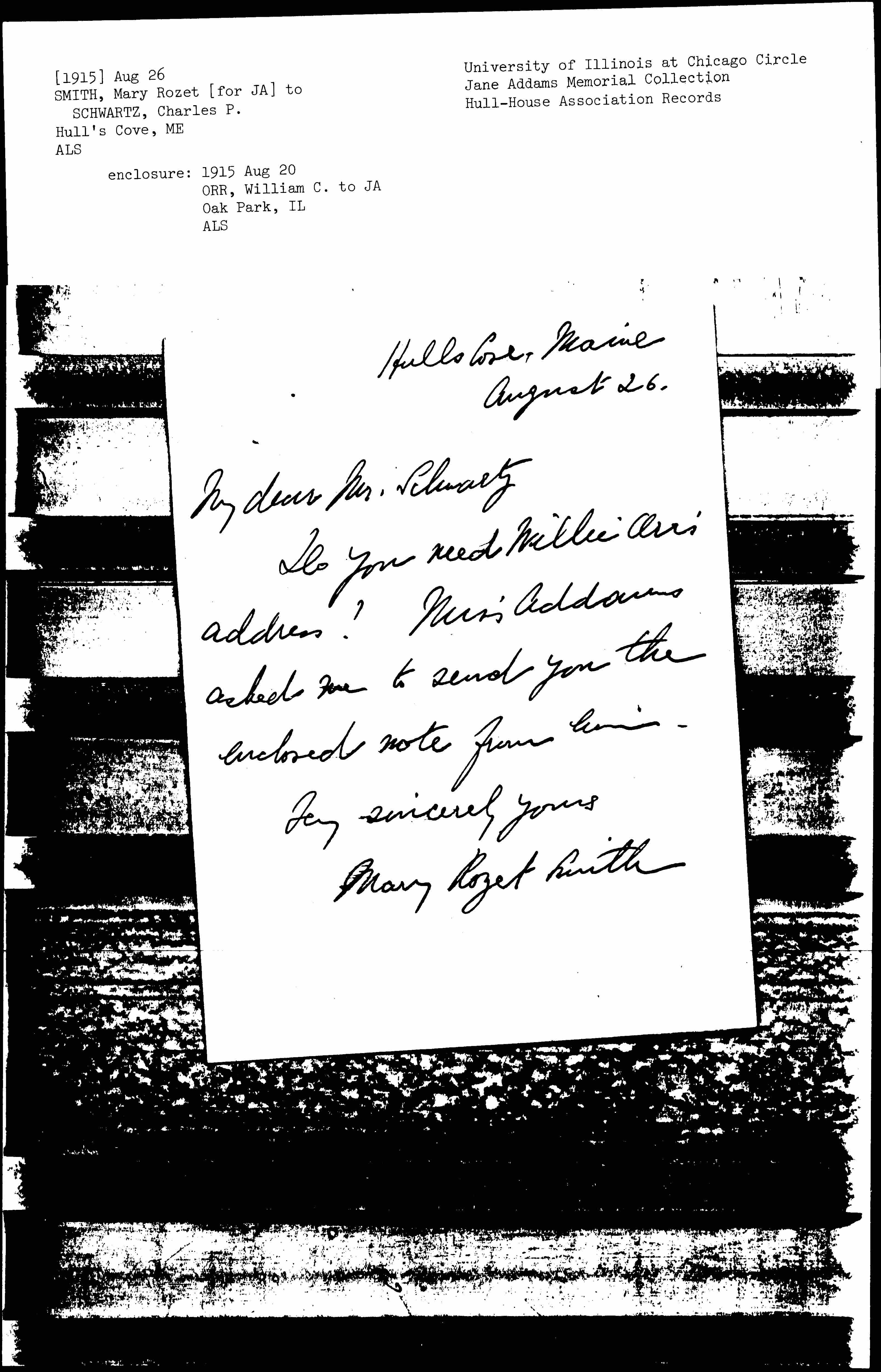 Do you need Willie Orr's address? Miss Addams asked me to send you the enclosed note from him.