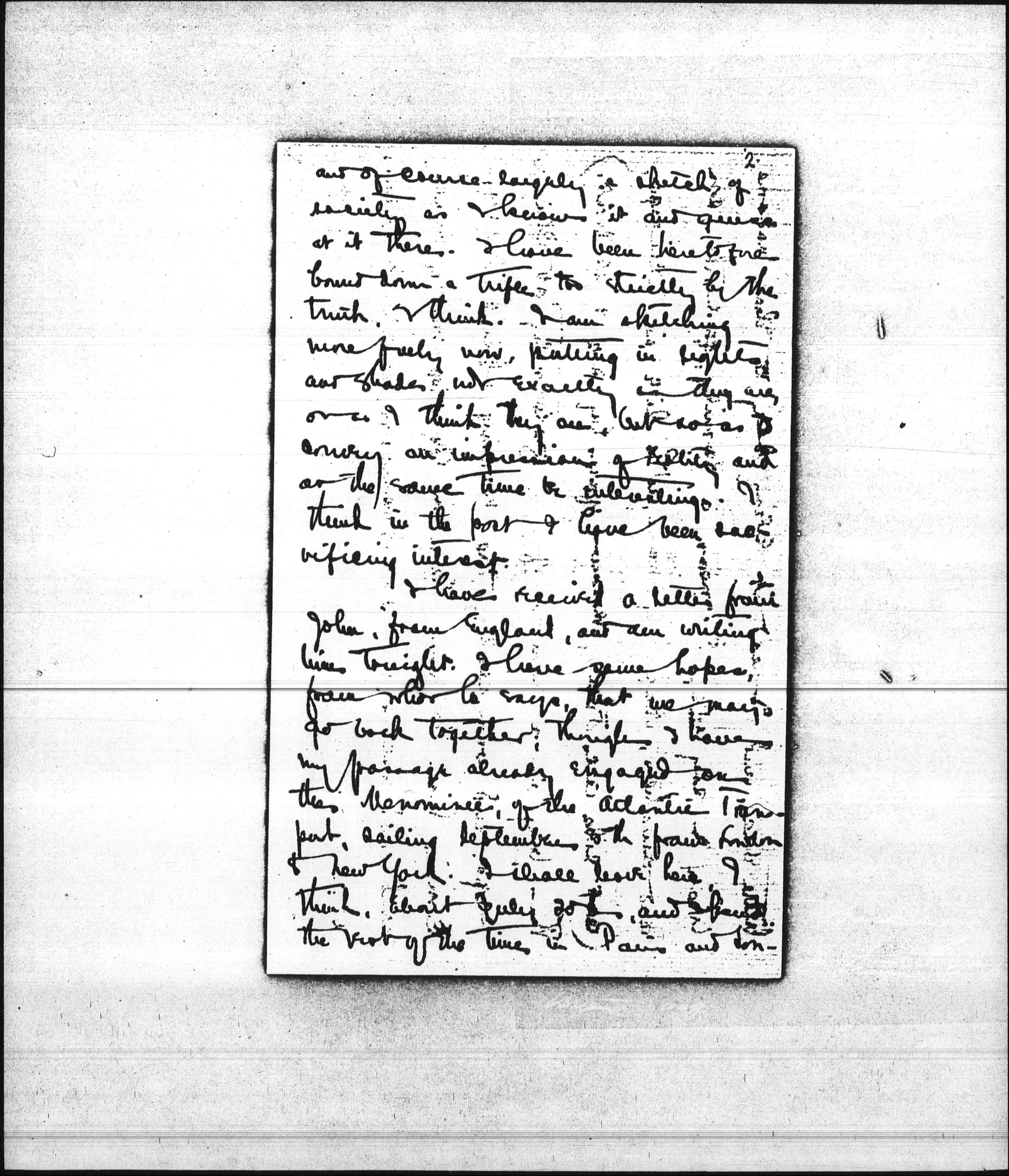 I have received a letter from John, from England, and am writing him tonight. I have some hopes, from what he says, that we may go back together, though I have my passage already engaged on the Menominee, of the Atlantic Transport, sailing September 8th from London to New York. I shall leave here, I think, about July 20th, and spend the rest of the time in Paris and London. [page 3] Any letters you write after July 20th I think you would better send to the Back of Scotland, in London I shall send you its exact address later.