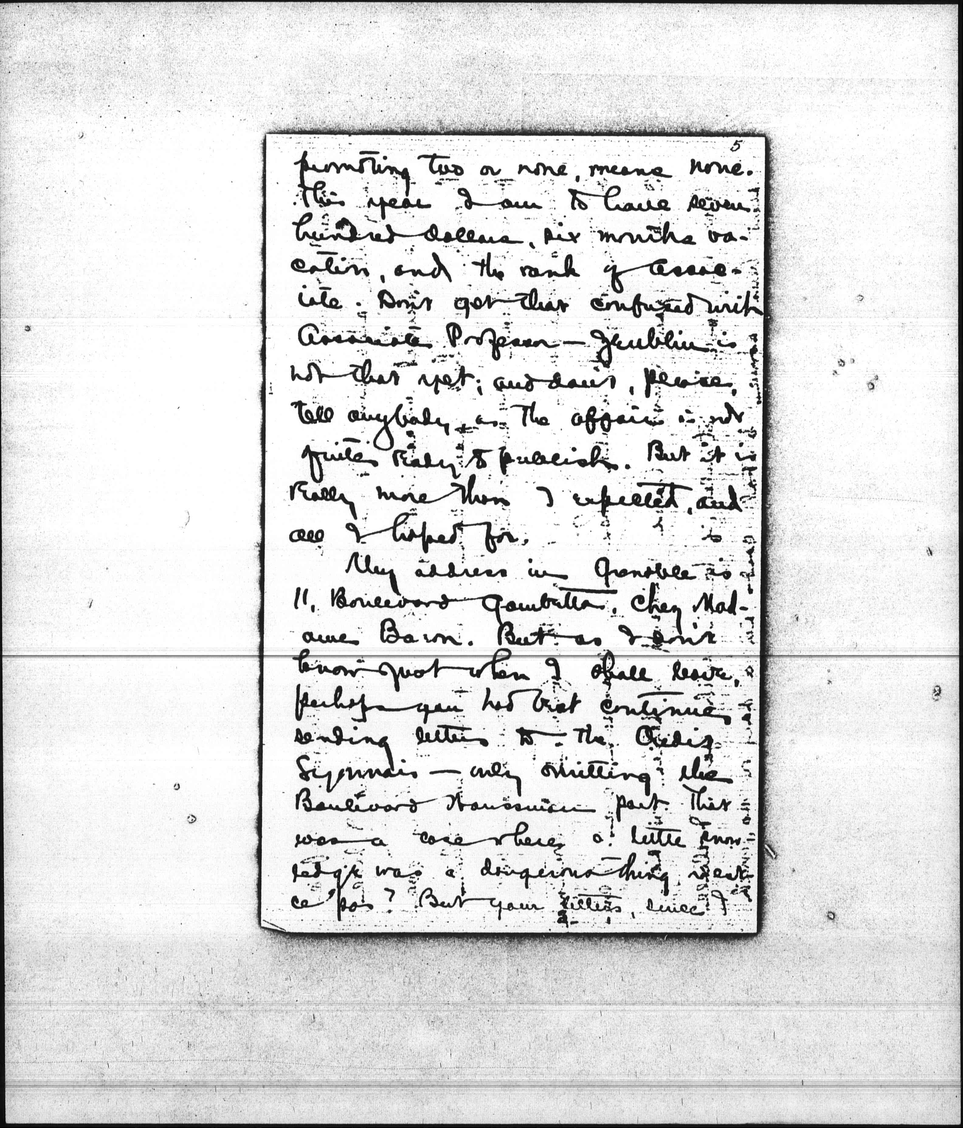 I have heard by the way, since I came here, from Mr. Herrick. The [news] is, I am to have a rise in both rank and salary. There is nobody in the department now, since Damon resigned, immediately ahead of me–-a great point, you see, since consequently there is nobody to hold my promotion back. Frequently the necessity of [page 5] promoting two or none, means none. This year I am to have seven hundred dollars, six months vaction, and the rank of Associate. Don't get that confused with Associate Professor – [Zueblin] is not that yet; and don't, please, tell anybody, as the affair is not quite ready to publish. But it is really more than I expected, and all I hoped for.