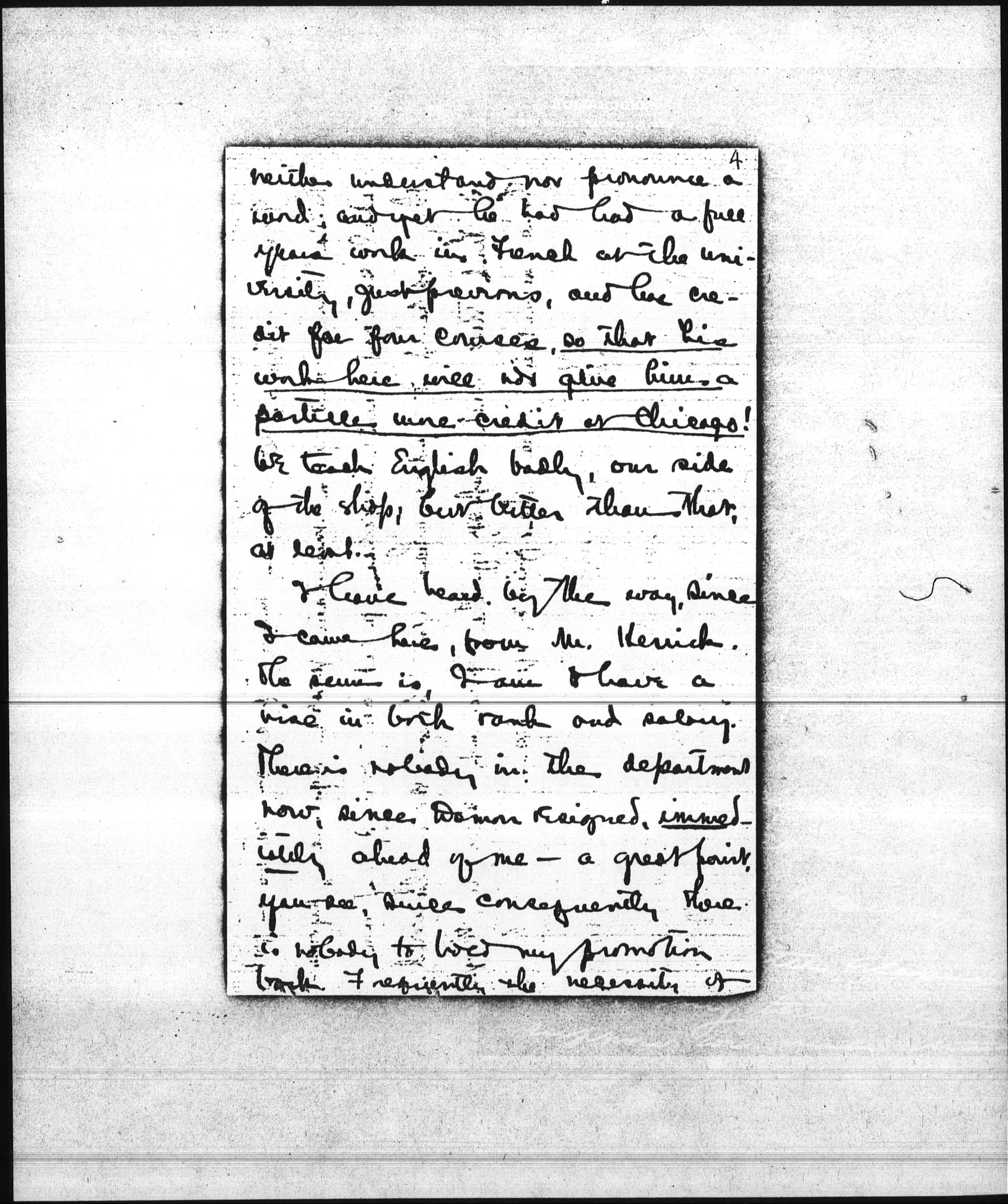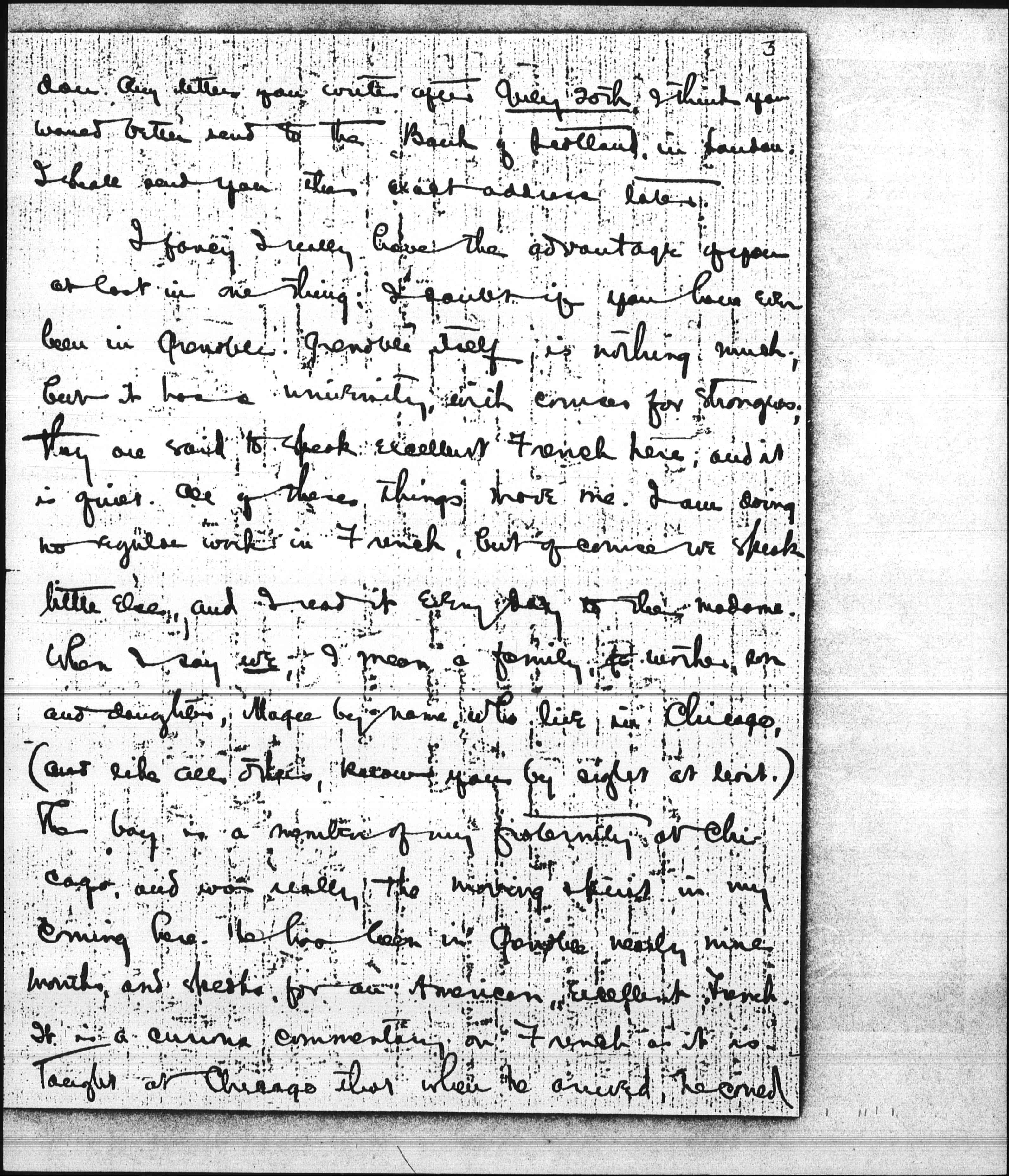 I fancy I really have the advantage if you at last in one thing. I doubt if you have even been in Grenoble. Grenoble itself is nothing much; but it has a university, with courses for strangers; they are said to speak excellent French here; and it is quiet. All of these things move me. I am doing no regular work in French, but of course we speak else, and I read it every day to the madame. When I say we, I mean a family, mother, son and dauther, Magee by name, who live in Chicago, (and like all others, know you by sight at least). The boy is a member of my fraternity at Chicago, and was really the moving spirit in my coming here. He has been in Grenoble nearly nine months, and speaks, for an American, excellent French. It is a curious commentary on French as it is taught at Chicago that when he arrived, he could [page 4] neither understand nor pronounce a word, and yet he had had a full years work in French at the university, just previous, and has credit for four courses, so that his work here will not give him a [particle] more-credit at Chicago! We teach English badly, our side of the shop, but better than that, at least.