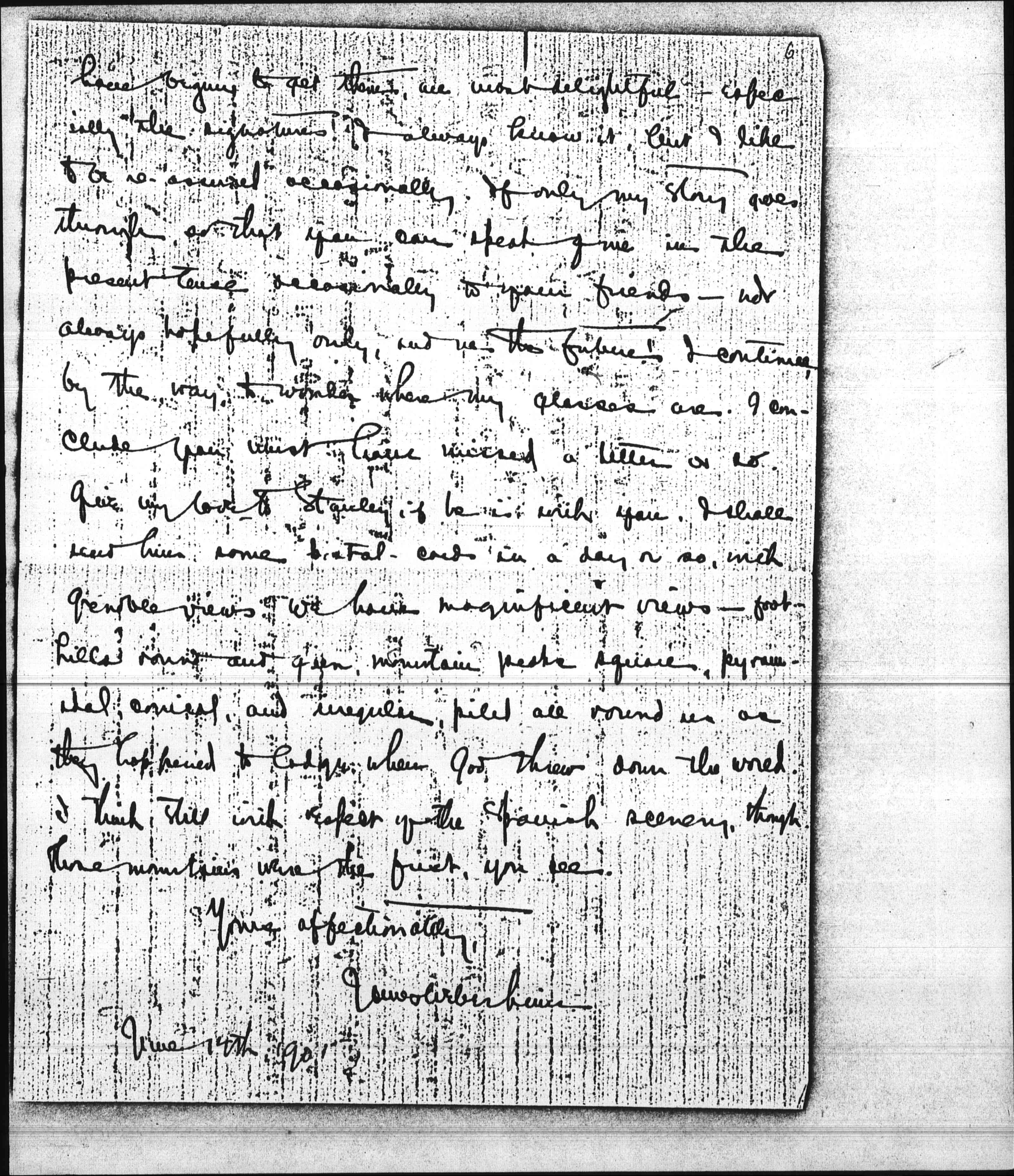 My address in Grenoble is 11, Boulevard Gambetta, Chez Madame Baron. But as I don't know just when I shall leave, perhaps you had best continue sending letters to the Credit Lyonnais--only omitting the Boulevard Haussmann part. This was a case where a little knowledge was a dangerous thing, n'est ce pas? But your letters, since I [page 6] have begun to get them, are most delightful – especially the signatures! I always know it, but I like to be re-assured occasionally. If only my story goes through, so that you can speak of me in the present tense occasionly to your friends-–not always hopefully only, and in the future. I continue by the way to wonder where my classes are. I conclude you must have missed a letter or so. Give my love to Stanley if he is with you. I shall send him some postal cards in a day or so, with Grenoble views. We have magnificent views-–foot hills round and green, mountain peaks square, pyramidal, conical, and irregular, piled all round us as they happened to lodge when God threw down the world. I think still with respect of the Spanish scenery, though. Those mountains were the first, you see.