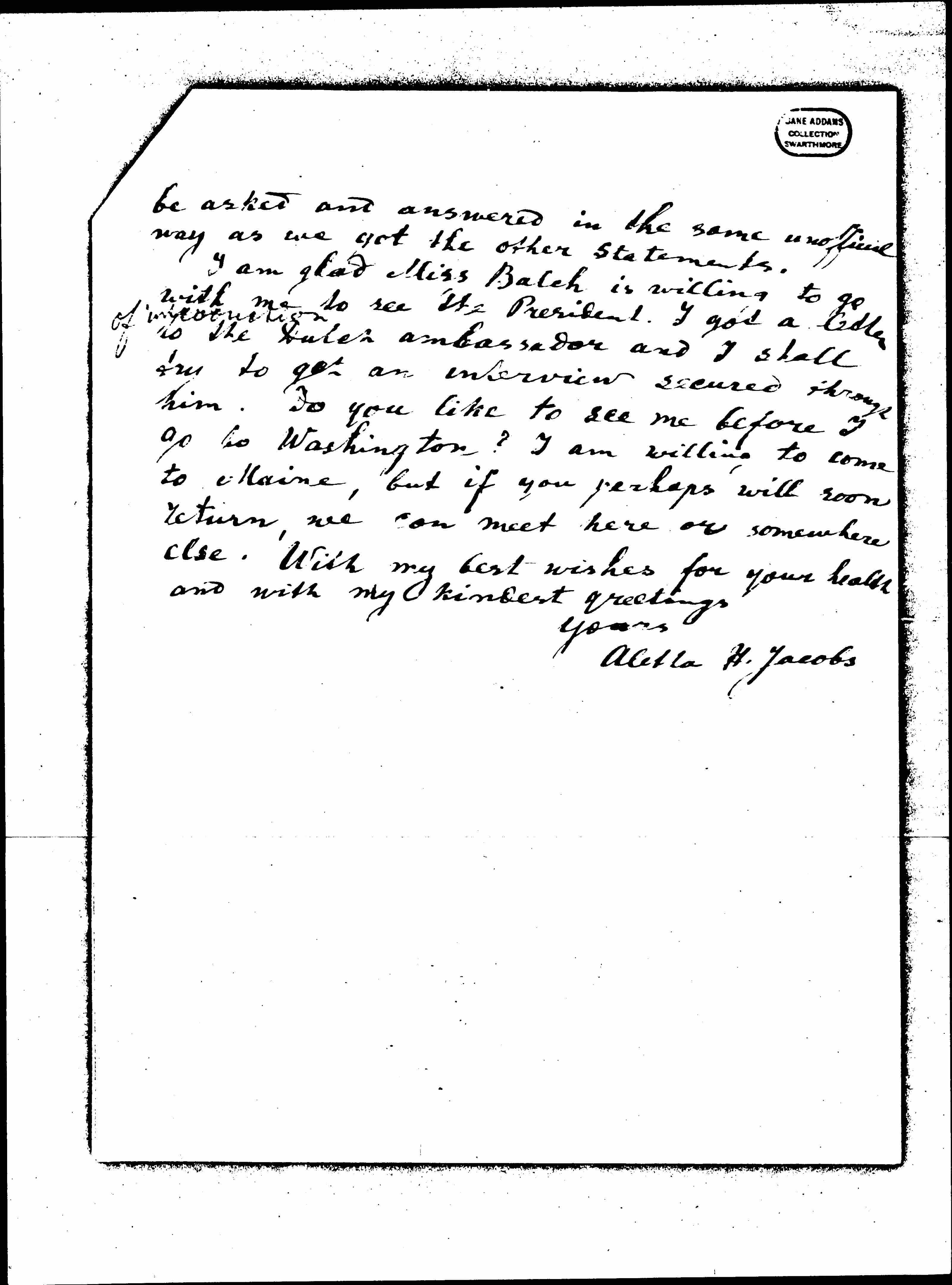 I am glad Miss Balch is willing to go with me to see the President. I got a letter <of introduction> to the Dutch ambassador and I shall try to get an interview secured through him. Do you like to see me before I go to Washington? I am willing to come to Maine, but if you perhaps will soon return, we can meet here or somewhere else. With my best wishes for your health and with my kindest greetings