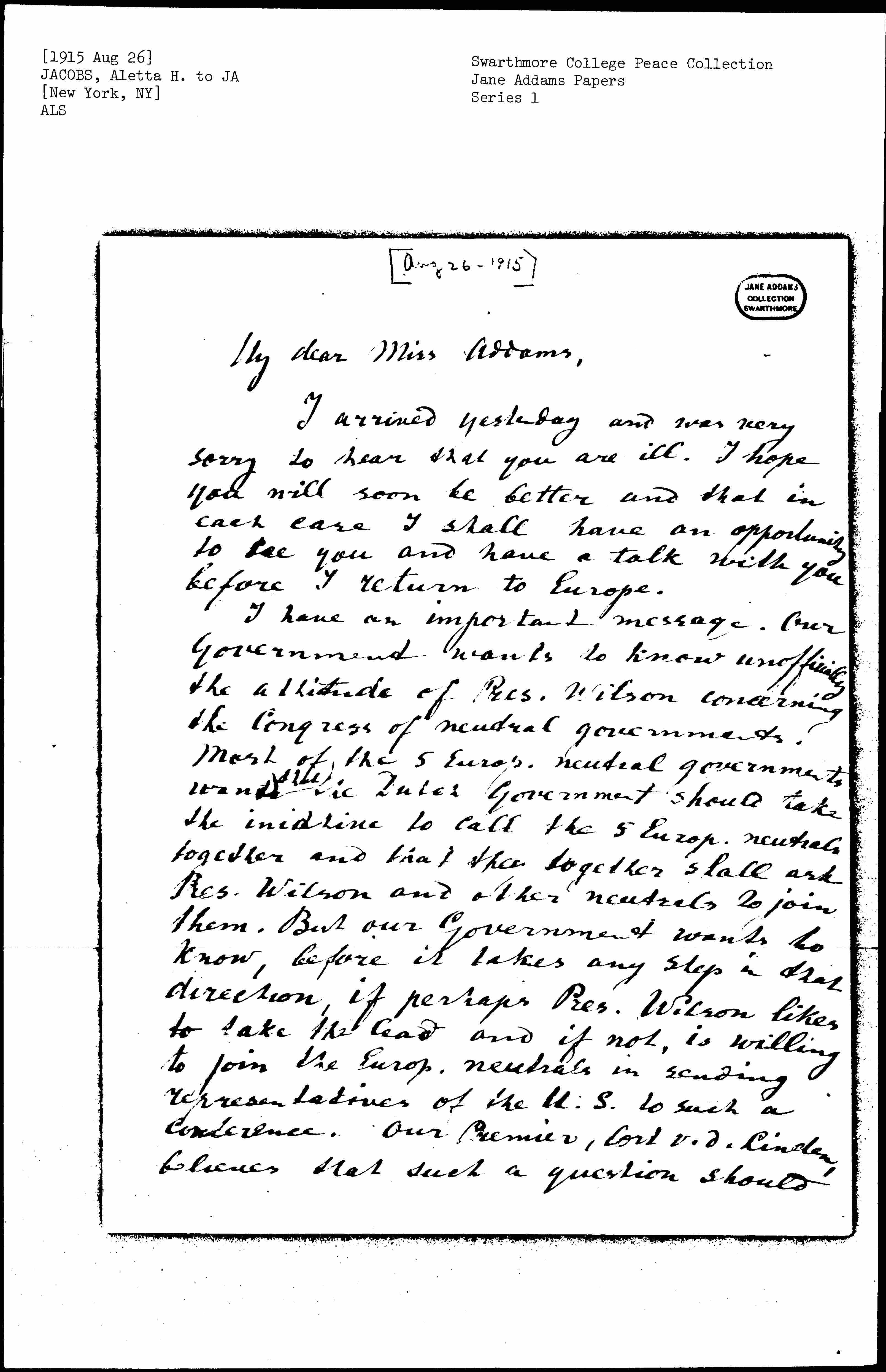 I have an important message. Our Government wants to know unofficially the attitude of Pres. Wilson concerning the Congress of neutral governments. Most of the 5 Europ. neutral governments want <[and]> the Dutch government should take the [incentive] to call the 5 Europ. neutrals together and that they together shall ask Pres. Wilson and other neutrals to join them. But our Government wants to know, before it takes any step in that direction, if perhaps Pres. Wilson likes to take the lead and if not, is willing to join the Europ. neutrals in sending representatives of the U.S. to such a conference. Our Premier, Cort v. d. Linden, believes that such a question should [page 2] be asked and answered in the same unofficial way as we got the other statements.